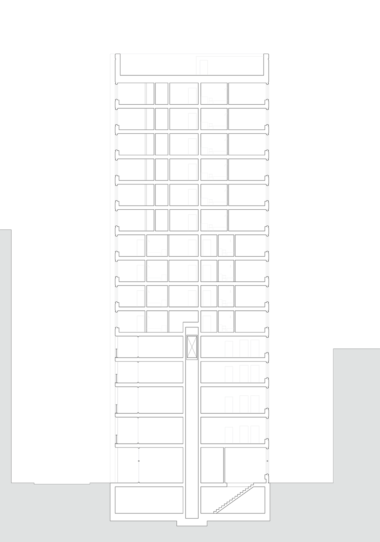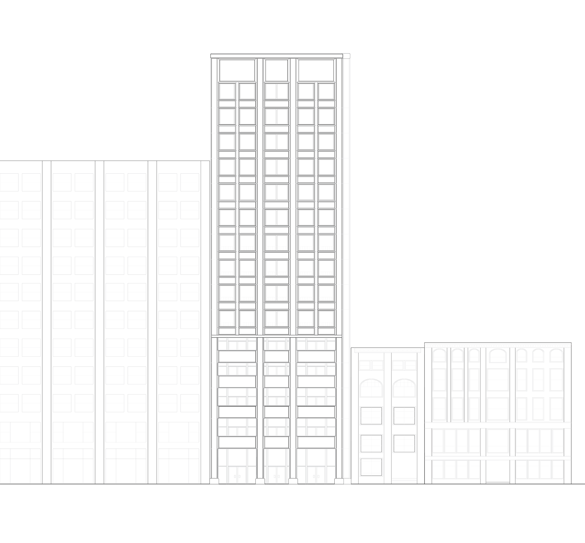 Ground floor retail is followed with several floors designed to accomodate office or living use.